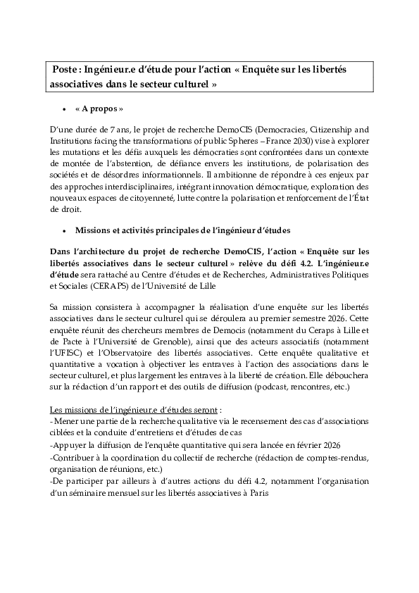 > Offre de poste : Ingénieur.e d’étude pour l’action « Enquête sur les libertés associatives dans le secteur culturel »